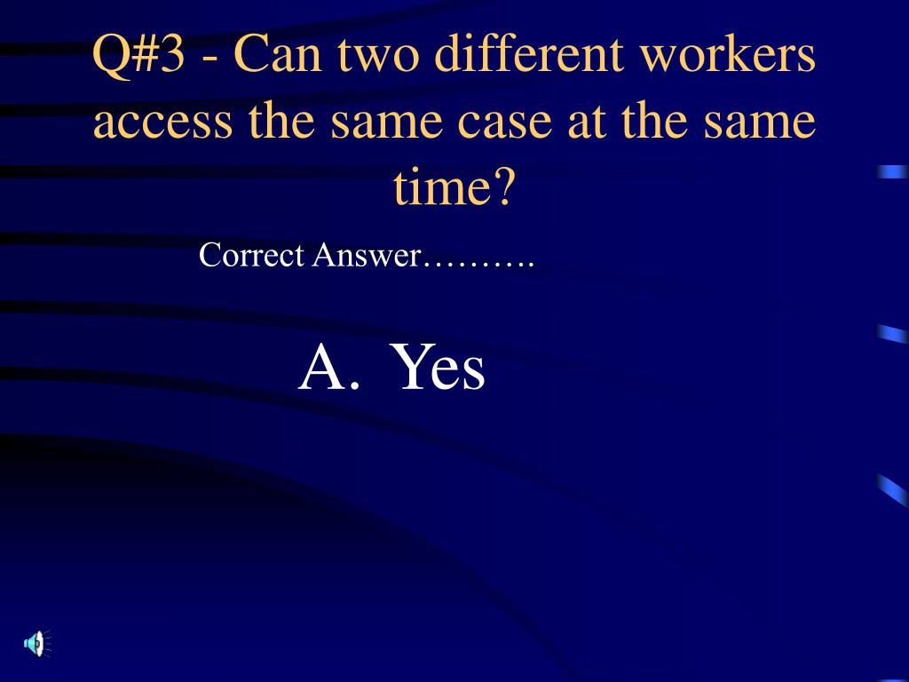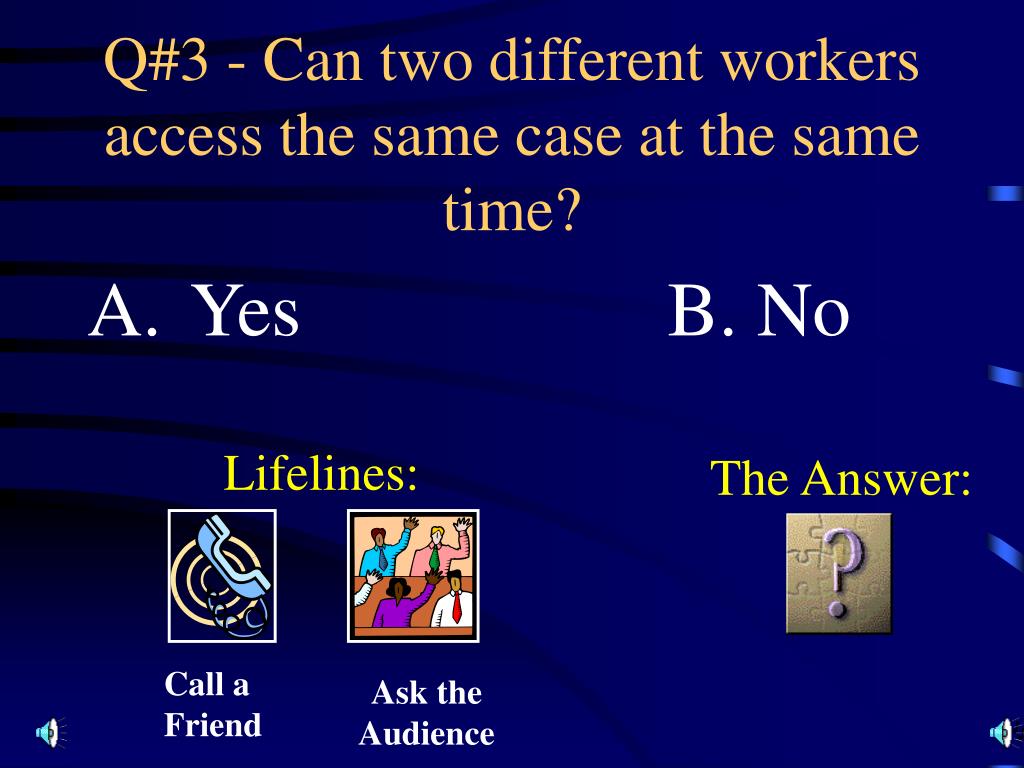 A. Yes B. No Q#3 - Can two different workers access the same case at the same time? Lifelines: The Answer: Call a Friend Ask the Audience
