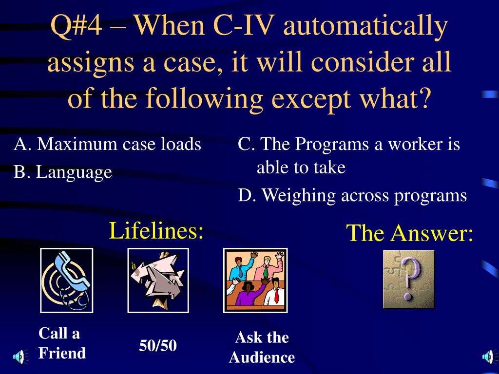 A. Maximum case loads B. Language C. The Programs a worker is able to take D. Weighing across programs Q#4 – When C-IV automatically assigns a case, it will consider all of the following except what? Lifelines: The Answer: Call a Friend Ask the Audience 50/50
