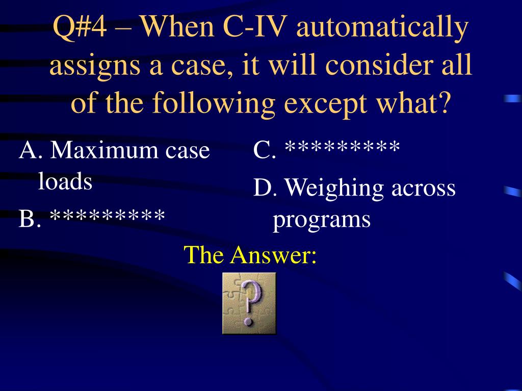 A. Maximum case loads B. ********* C. ********* D. Weighing across programs Q#4 – When C-IV automatically assigns a case, it will consider all of the following except what? The Answer:
