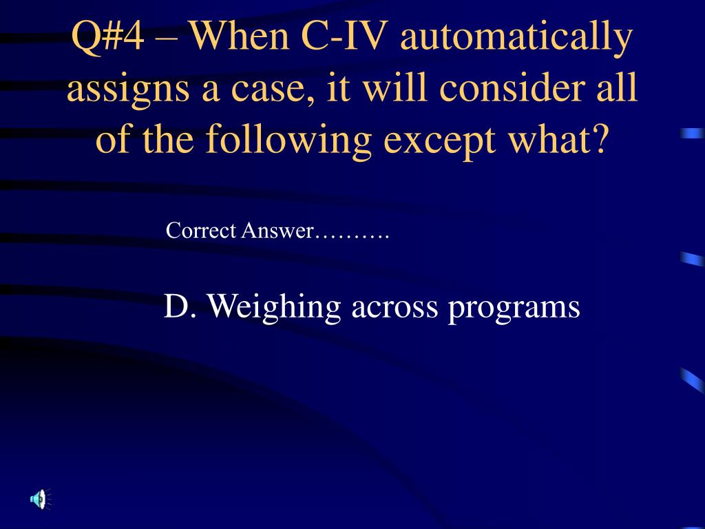Q#4 – When C-IV automatically assigns a case, it will consider all of the following except what? Correct Answer………. D. Weighing across programs