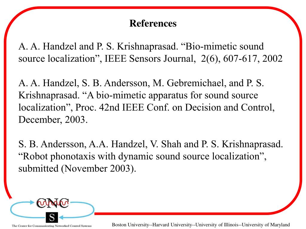 A. A. Handzel and P. S. Krishnaprasad. “Bio-mimetic sound source localization”, IEEE Sensors Journal, 2(6), 607-617, 2002 A. A. Handzel, S. B. Andersson, M. Gebremichael, and P. S. Krishnaprasad. “A bio-mimetic apparatus for sound source localization”, Proc. 42nd IEEE Conf. on Decision and Control, December, 2003. S. B. Andersson, A.A. Handzel, V. Shah and P. S. Krishnaprasad. “Robot phonotaxis with dynamic sound source localization”, submitted (November 2003). References
