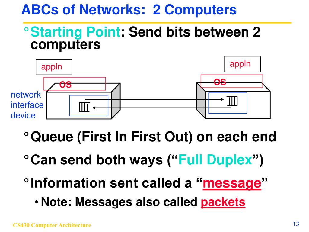 appln appln OS OS network interface device ABCs of Networks: 2 Computers • Starting Point: Send bits between 2 computers • Queue (First In First Out) on each end • Can send both ways (“Full Duplex”) • Information sent called a “message” • Note: Messages also called packets