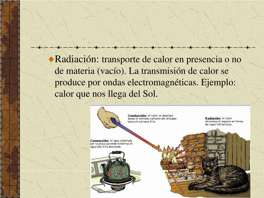 Radiación: transporte de calor en presencia o no de materia (vacío). La transmisión de calor se produce por ondas electromagnéticas. Ejemplo: calor que nos llega del Sol.