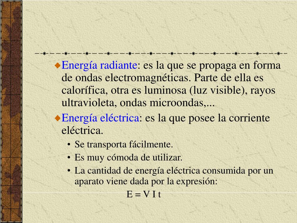 Energía radiante: es la que se propaga en forma de ondas electromagnéticas. Parte de ella es calorífica, otra es luminosa (luz visible), rayos ultravioleta, ondas microondas,... • Energía eléctrica: es la que posee la corriente eléctrica. • Se transporta fácilmente. • Es muy cómoda de utilizar. • La cantidad de energía eléctrica consumida por un aparato viene dada por la expresión: E = V I t