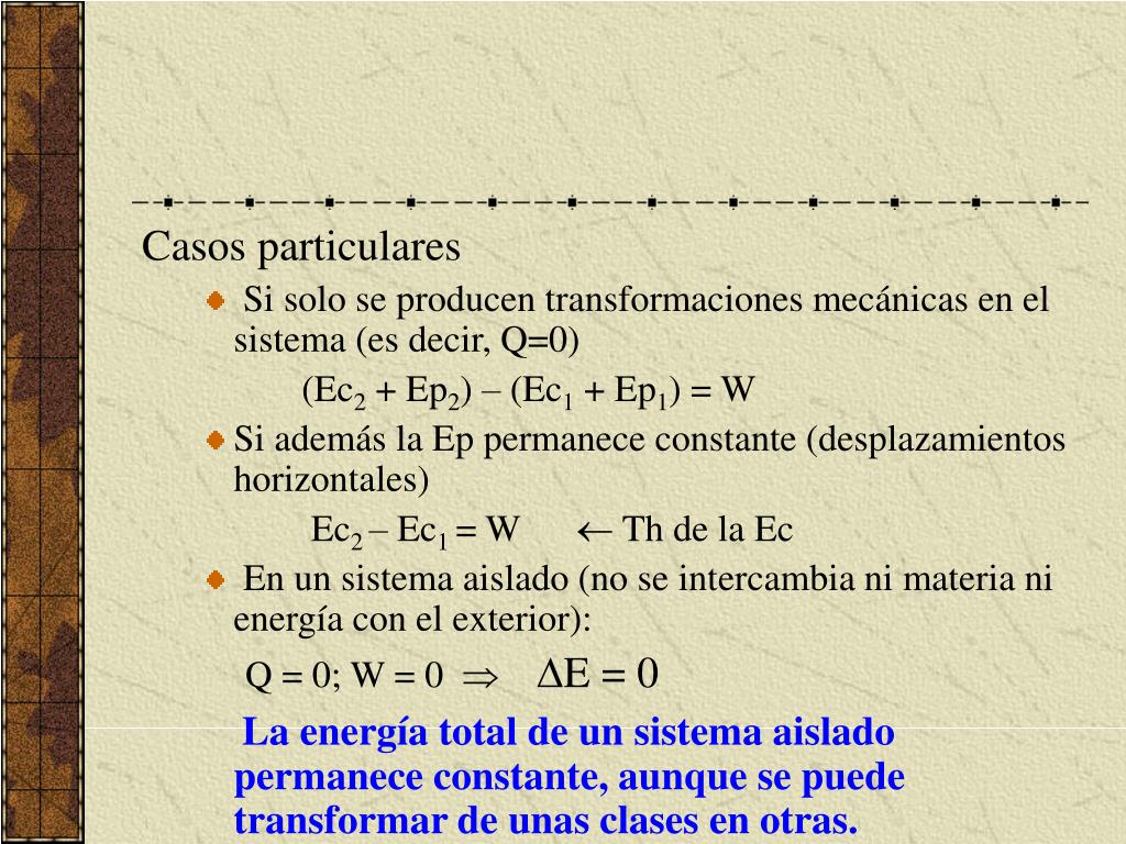 Casos particulares • Si solo se producen transformaciones mecánicas en el sistema (es decir, Q=0) (Ec2 + Ep2) – (Ec1 + Ep1) = W • Si además la Ep permanece constante (desplazamientos horizontales) Ec2 – Ec1 = W Th de la Ec • En un sistema aislado (no se intercambia ni materia ni energía con el exterior): Q = 0; W = 0 E = 0 La energía total de un sistema aislado permanece constante, aunque se puede transformar de unas clases en otras.