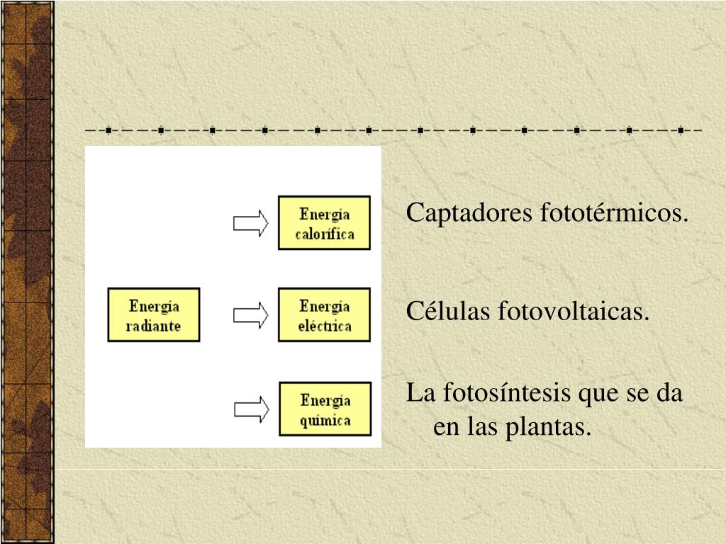 Captadores fototérmicos. Células fotovoltaicas. La fotosíntesis que se da en las plantas.