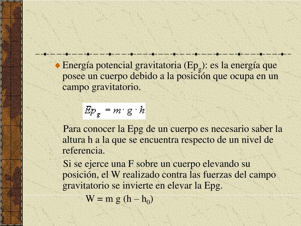 Energía potencial gravitatoria (Epg): es la energía que posee un cuerpo debido a la posición que ocupa en un campo gravitatorio. Para conocer la Epg de un cuerpo es necesario saber la altura h a la que se encuentra respecto de un nivel de referencia. Si se ejerce una F sobre un cuerpo elevando su posición, el W realizado contra las fuerzas del campo gravitatorio se invierte en elevar la Epg. W = m g (h – h0)