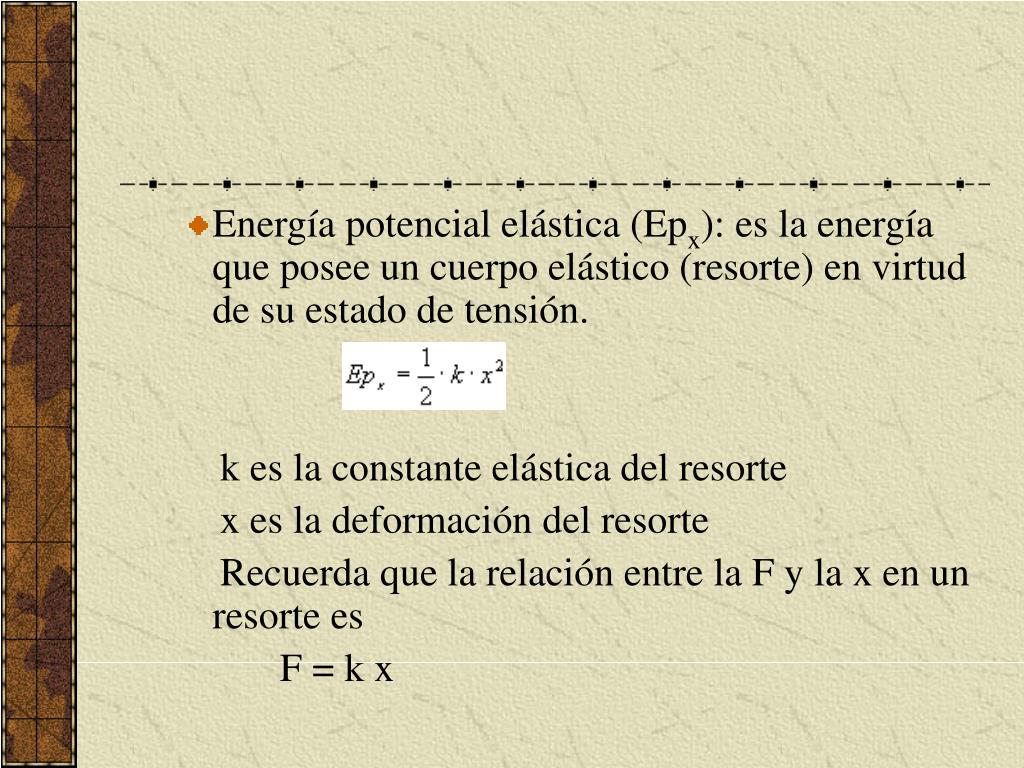 Energía potencial elástica (Epx): es la energía que posee un cuerpo elástico (resorte) en virtud de su estado de tensión. k es la constante elástica del resorte x es la deformación del resorte Recuerda que la relación entre la F y la x en un resorte es F = k x