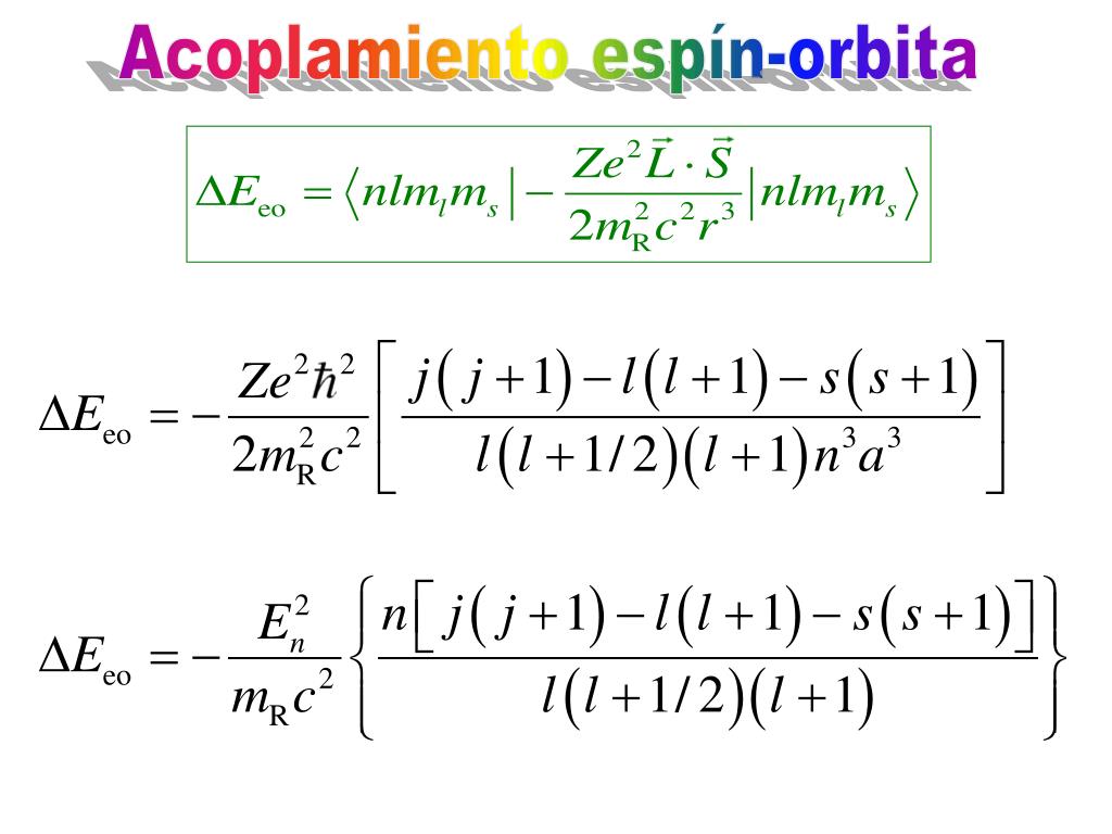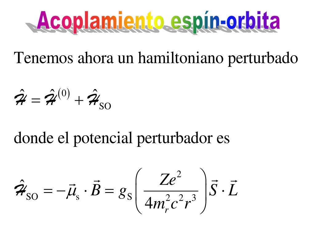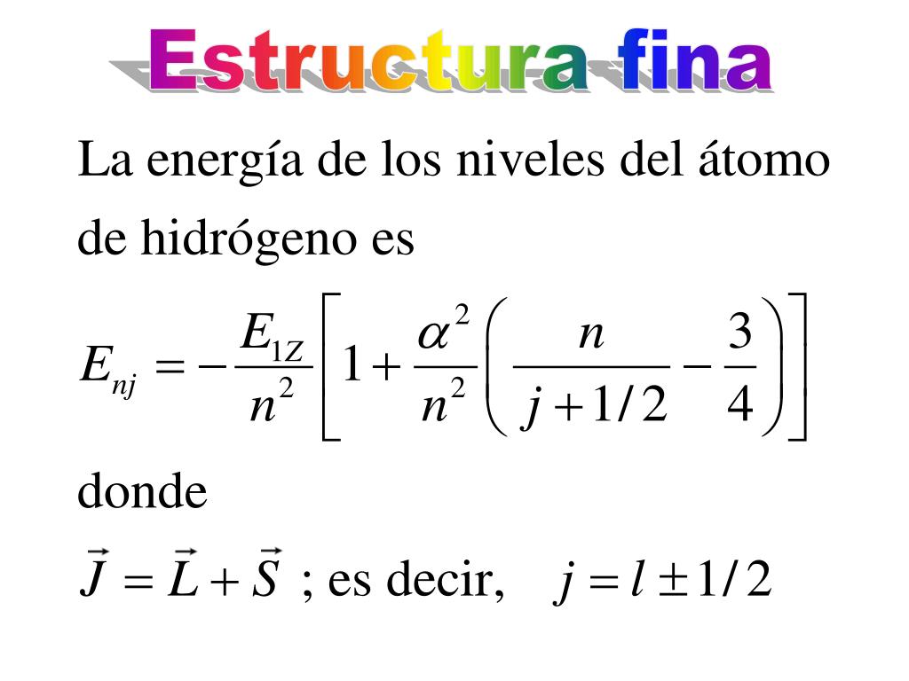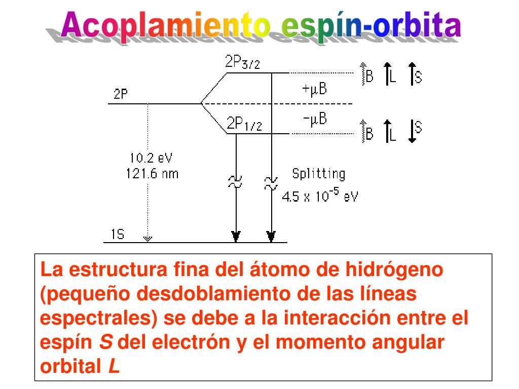 Acoplamiento espín-orbita La estructura fina del átomo de hidrógeno (pequeño desdoblamiento de las líneas espectrales) se debe a la interacción entre el espín S del electrón y el momento angular orbital L