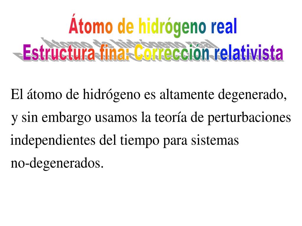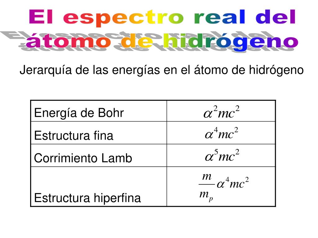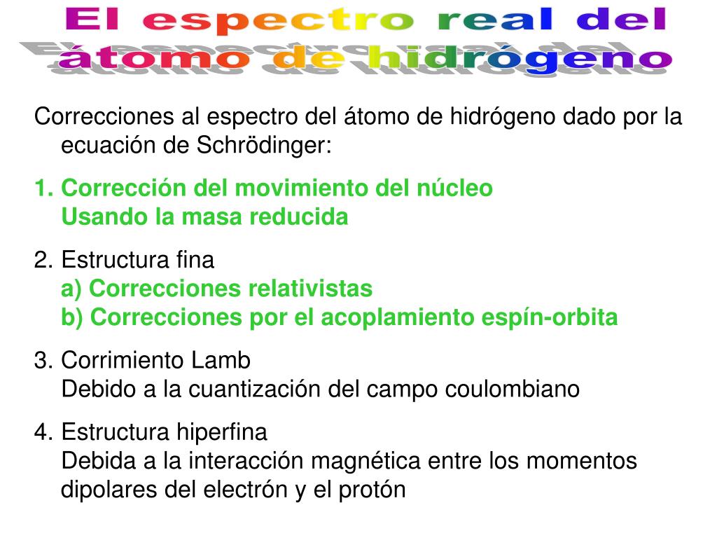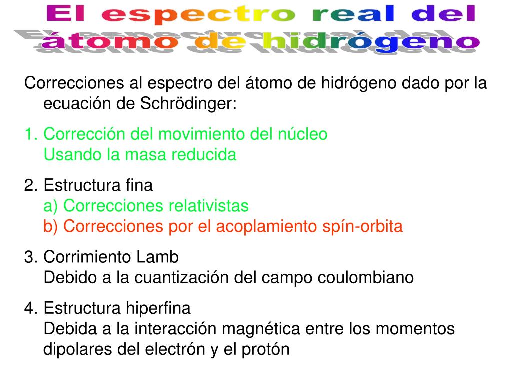 El espectro real del átomo de hidrógeno • Correcciones al espectro del átomo de hidrógeno dado por la ecuación de Schrödinger: • Corrección del movimiento del núcleoUsando la masa reducida • Estructura finaa) Correcciones relativistasb) Correcciones por el acoplamiento spín-orbita • Corrimiento LambDebido a la cuantización del campo coulombiano • Estructura hiperfinaDebida a la interacción magnética entre los momentos dipolares del electrón y el protón