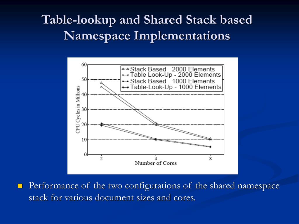 Table-lookup and Shared Stack based Namespace Implementations • Performance of the two configurations of the shared namespace stack for various document sizes and cores.