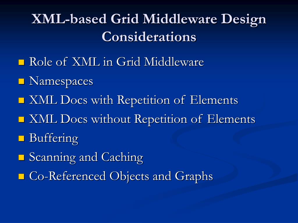 XML-based Grid Middleware Design Considerations • Role of XML in Grid Middleware • Namespaces • XML Docs with Repetition of Elements • XML Docs without Repetition of Elements • Buffering • Scanning and Caching • Co-Referenced Objects and Graphs