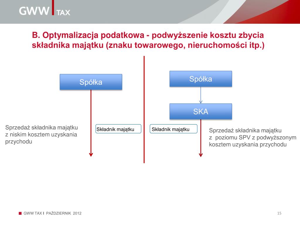 B. Optymalizacja podatkowa - podwyższenie kosztu zbycia składnika majątku (znaku towarowego, nieruchomości itp.) Spółka Spółka SKA Sprzedaż składnika majątku z niskim kosztem uzyskania przychodu Składnik majątku Składnik majątku Sprzedaż składnika majątku z poziomu SPV z podwyższonym kosztem uzyskania przychodu