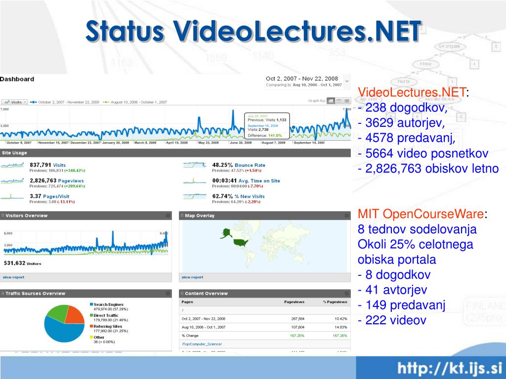 Status VideoLectures.NET VideoLectures.NET: - 238 dogodkov, - 3629 autorjev, - 4578 predavanj, - 5664 video posnetkov - 2,826,763 obiskov letno MIT OpenCourseWare: 8 tednov sodelovanja Okoli 25% celotnega obiska portala - 8 dogodkov - 41 avtorjev - 149 predavanj - 222 videov