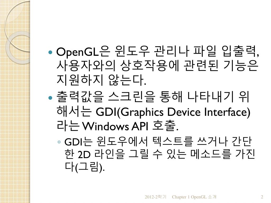 OpenGL은 윈도우 관리나 파일 입출력, 사용자와의 상호작용에 관련된 기능은 지원하지 않는다. • 출력값을 스크린을 통해 나타내기 위해서는 GDI(Graphics Device Interface)라는 Windows API 호출. • GDI는 윈도우에서 텍스트를 쓰거나 간단한 2D 라인을 그릴 수 있는 메소드를 가진다(그림). Chapter 1 OpenGL 소개
