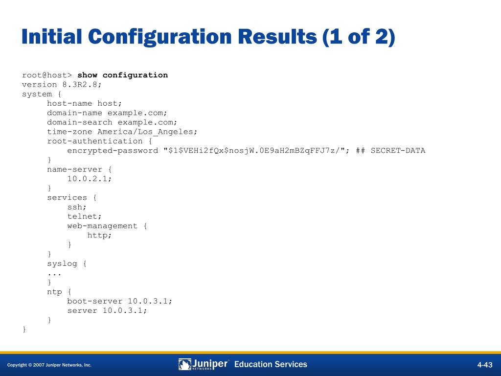 Initial Configuration Results (1 of 2) root@host> show configuration version 8.3R2.8; system { host-name host; domain-name example.com; domain-search example.com; time-zone America/Los_Angeles; root-authentication { encrypted-password "$1$VEHi2fQx$nosjW.0E9aH2mBZqFFJ7z/"; ## SECRET-DATA } name-server { 10.0.2.1; } services { ssh; telnet; web-management { http; } } syslog { ... } ntp { boot-server 10.0.3.1; server 10.0.3.1; } }