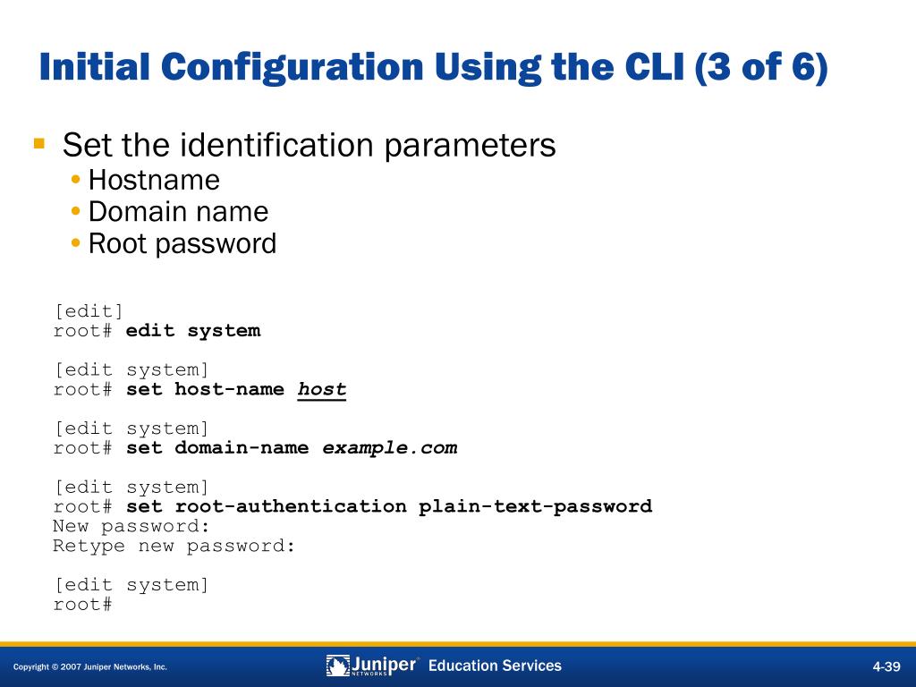 Initial Configuration Using the CLI (3 of 6) • Set the identification parameters • Hostname • Domain name • Root password [edit] root# edit system [edit system] root# set host-name host [edit system] root# set domain-name example.com [edit system] root# set root-authentication plain-text-password New password: Retype new password: [edit system] root#