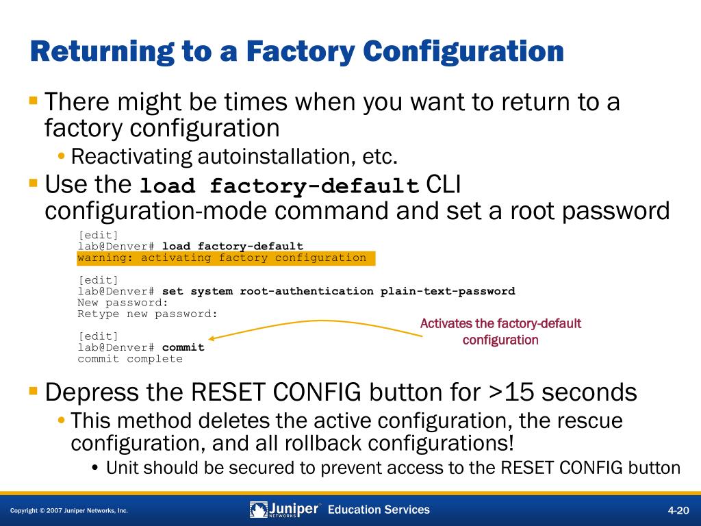 Returning to a Factory Configuration • There might be times when you want to return to a factory configuration • Reactivating autoinstallation, etc. • Use the load factory-default CLI configuration-mode command and set a root password • Depress the RESET CONFIG button for >15 seconds • This method deletes the active configuration, the rescue configuration, and all rollback configurations! • Unit should be secured to prevent access to the RESET CONFIG button [edit] lab@Denver# load factory-default warning: activating factory configuration [edit] lab@Denver# set system root-authentication plain-text-password New password: Retype new password: [edit] lab@Denver# commit commit complete Activates the factory-default configuration