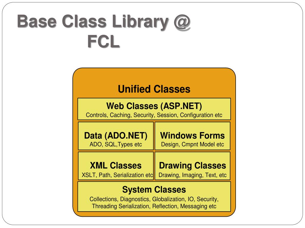Framework Class Library @ BCL • Single consistent set of object oriented class libraries to enable building distributed web applications (Unified Classes) • Built using classes arranged across logical hierarchical namespaces • Work with all CLR languages • No more “VBRun” or “MFC” divide