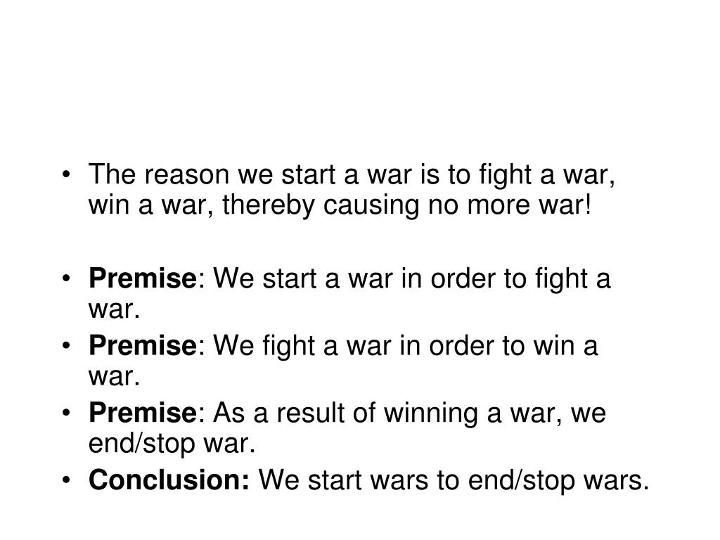 The reason we start a war is to fight a war, win a war, therebycausing no more war! • Premise: We start a war in order to fight a war. • Premise: We fight a war in order to win a war. • Premise: As a result of winning a war, we end/stop war. • Conclusion: We start wars to end/stop wars.