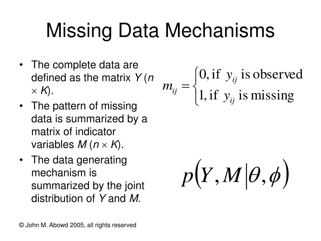 Missing Data Mechanisms • The complete data are defined as the matrix Y (nK). • The pattern of missing data is summarized by a matrix of indicator variables M (nK). • The data generating mechanism is summarized by the joint distribution of Y and M. © John M. Abowd 2005, all rights reserved