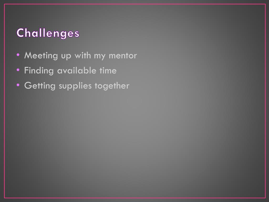 Challenges • Meeting up with my mentor • Finding available time • Getting supplies together
