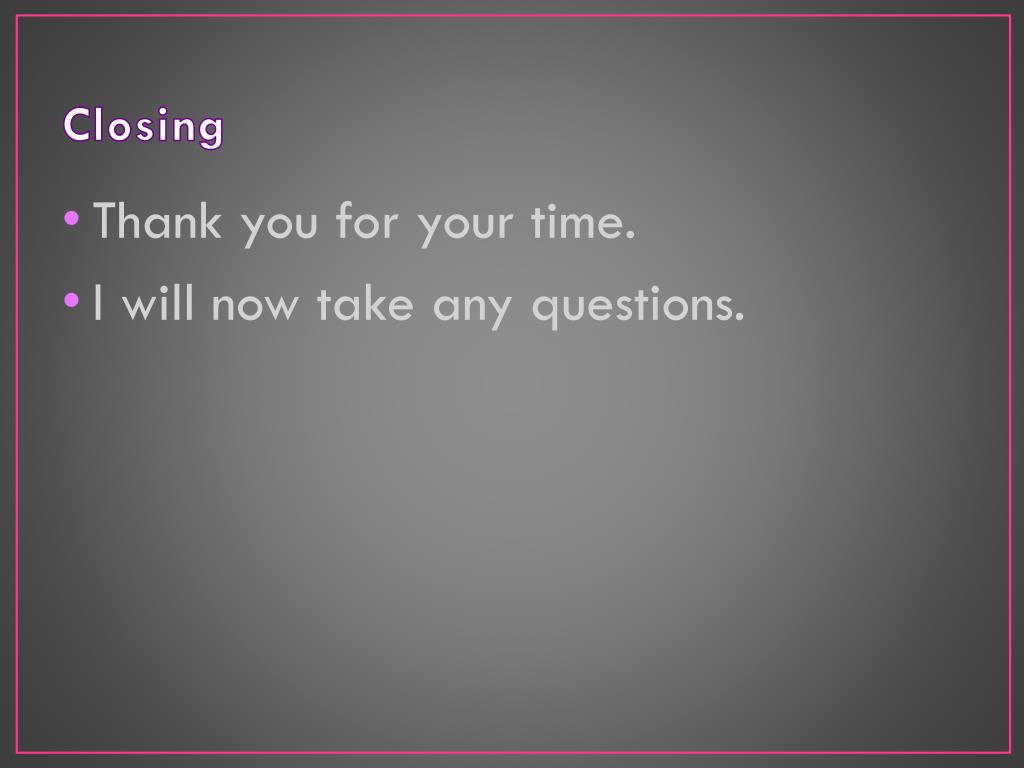 Closing • Thank you for your time. • I will now take any questions.