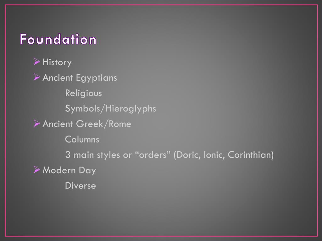 Foundation • History • Ancient Egyptians Religious Symbols/Hieroglyphs • Ancient Greek/Rome Columns 3 main styles or “orders” (Doric, Ionic, Corinthian) • Modern Day Diverse