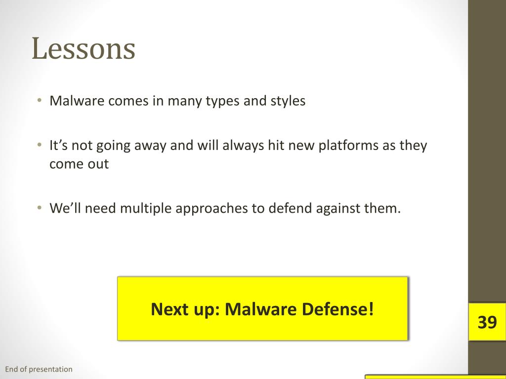Lessons • Malware comes in many types and styles • It’s not going away and will always hit new platforms as they come out • We’ll need multiple approaches to defend against them. Next up: Malware Defense! 38 38 39 End of presentation