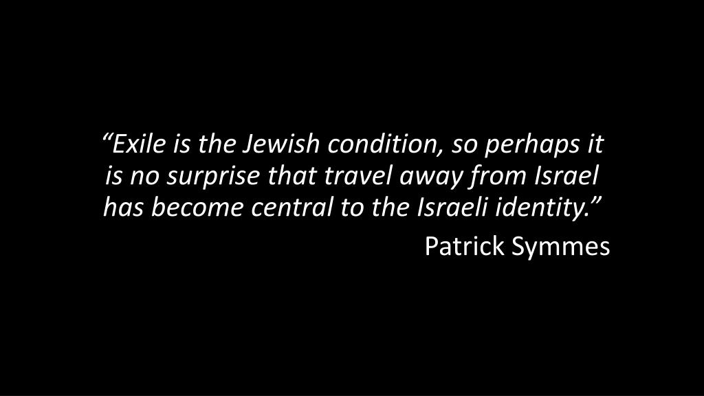 “Exile is the Jewish condition, so perhaps it is no surprise that travel away from Israel has become central to the Israeli identity.” Patrick Symmes
