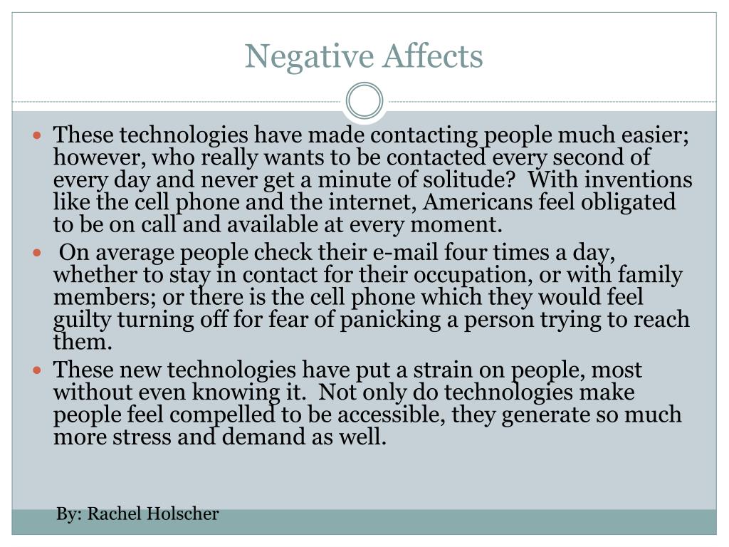 Negative Affects These technologies have made contacting people much easier; however, who really wants to be contacted every second of every day and never get a minute of solitude? With inventions like the cell phone and the internet, Americans feel obligated to be on call and available at every moment. On average people check their e-mail four times a day, whether to stay in contact for their occupation, or with family members; or there is the cell phone which they would feel guilty turning off for fear of panicking a person trying to reach them. These new technologies have put a strain on people, most without even knowing it. Not only do technologies make people feel compelled to be accessible, they generate so much more stress and demand as well. By: Rachel Holscher