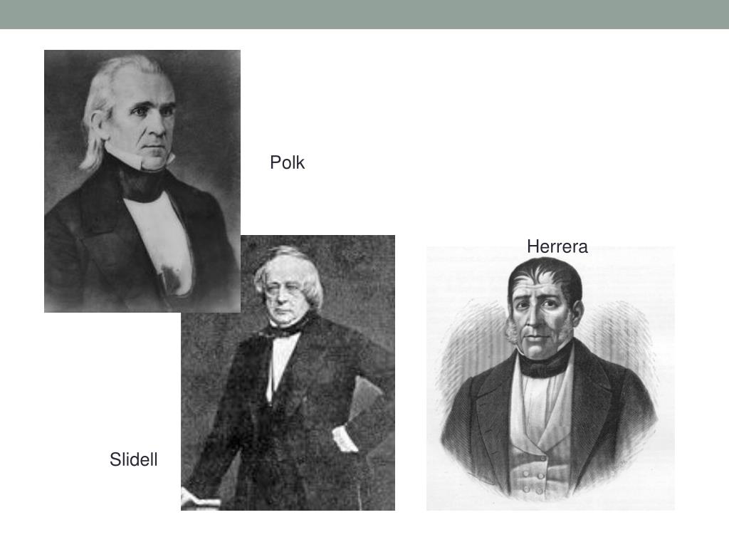 “Purposeful Polk” and John Slidell’s mission • In November 1845, President Polk sent John Slidell to Mexico to negotiate a settlement. • Slidell was authorized to: • accept the Rio Grande River as the southern border of US. • Offer $5 million dollars for the purchase of New Mexico territory. • Offer $25 million dollars for the purchase of California. • Mexico had expected to: • discuss the return of (or at least compensation for) Texas. • Mexican President Herrera refused to see Slidell and threatened to have him arrested.