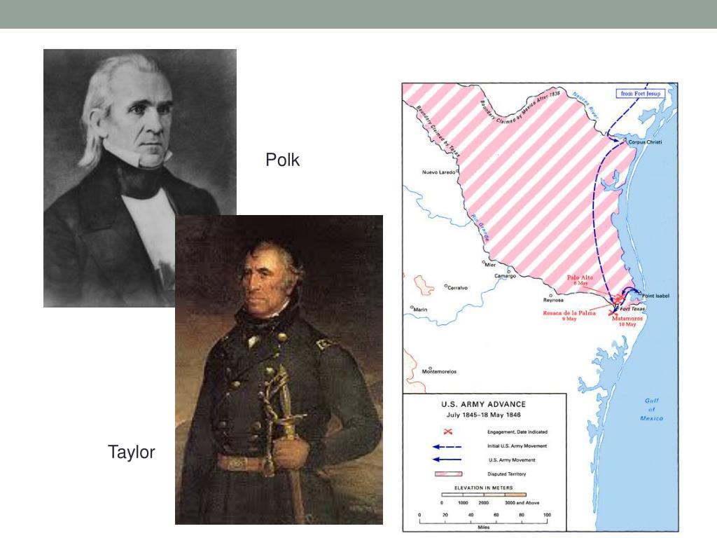 “Purposeful Polk” andZachary Taylor • Jan. 1846, Polk orders General Zachary Taylor, “Old Rough and Ready,” and US forces to Texas to prepare to defend the border and a US naval force is sent into the Caribbean Sea. • March 1846, Taylor crosses the Nueces River in an effort to establish fortifications along the Rio Grande River. • April 1846, Mexican forces cross Rio Grande and fights with US scouting party. 11 Americans die • May 1846, Polk presents war message to Congress and war is declared two days later.