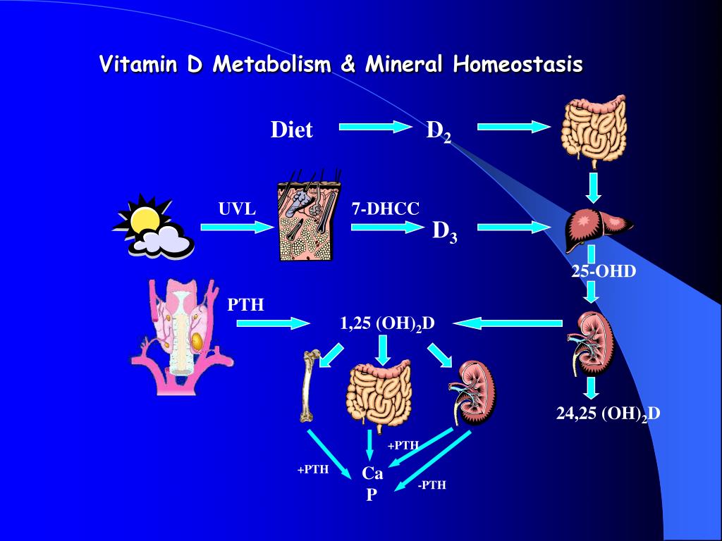 Vitamin D Metabolism & Mineral Homeostasis Diet D2 UVL 7-DHCC D3 25-OHD PTH 1,25 (OH)2D 24,25 (OH)2D +PTH +PTH Ca P -PTH