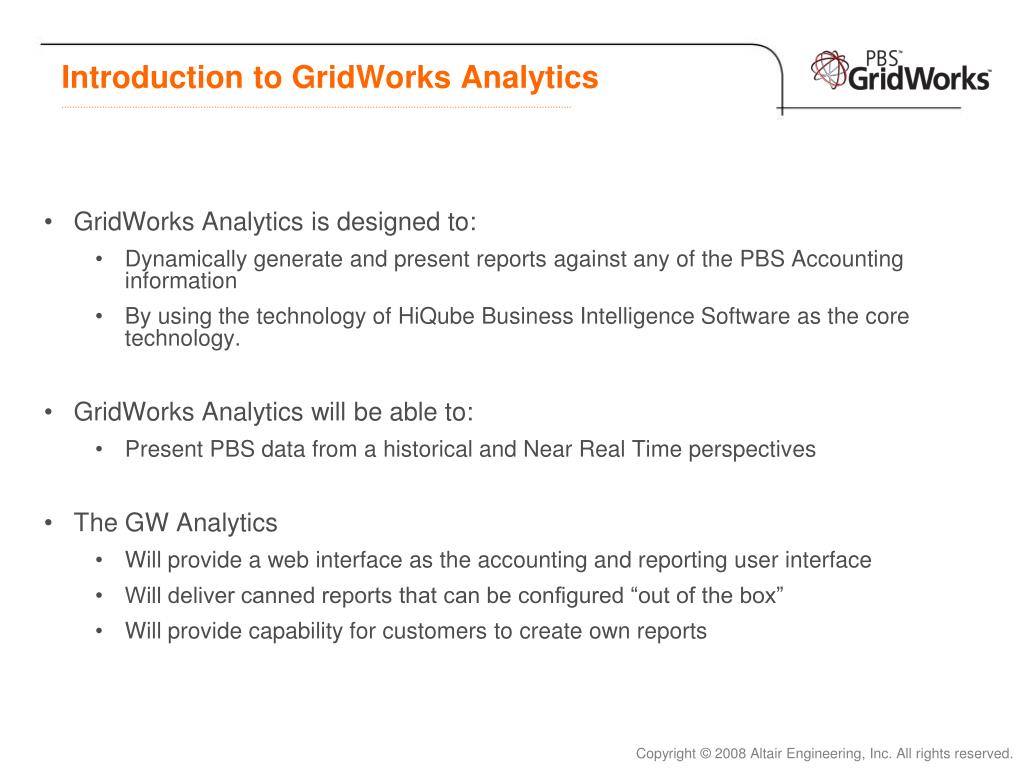 Introduction to GridWorks Analytics GridWorks Analytics is designed to: Dynamically generate and present reports against any of the PBS Accounting information By using the technology of HiQube Business Intelligence Software as the core technology. GridWorks Analytics will be able to: Present PBS data from a historical and Near Real Time perspectives The GW Analytics Will provide a web interface as the accounting and reporting user interface Will deliver canned reports that can be configured “out of the box” Will provide capability for customers to create own reports