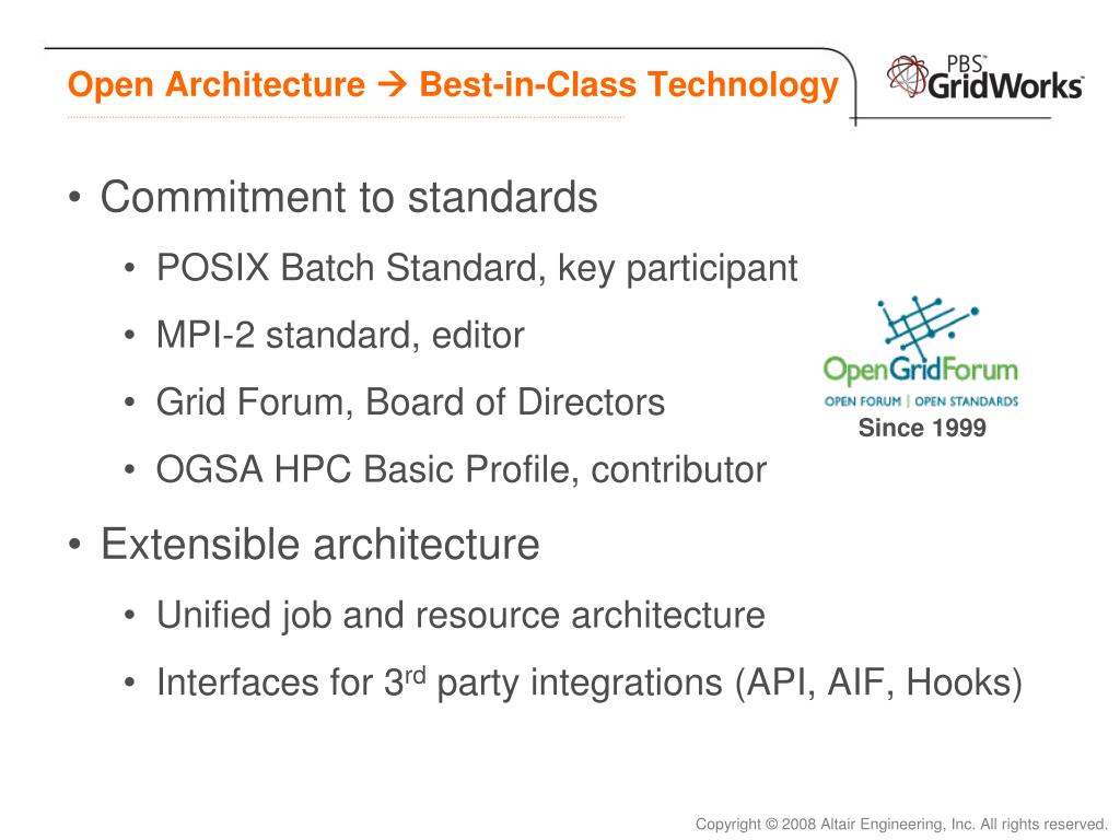 Since 1999 Open Architecture Best-in-Class Technology • Commitment to standards • POSIX Batch Standard, key participant • MPI-2 standard, editor • Grid Forum, Board of Directors • OGSA HPC Basic Profile, contributor • Extensible architecture • Unified job and resource architecture • Interfaces for 3rd party integrations (API, AIF, Hooks)