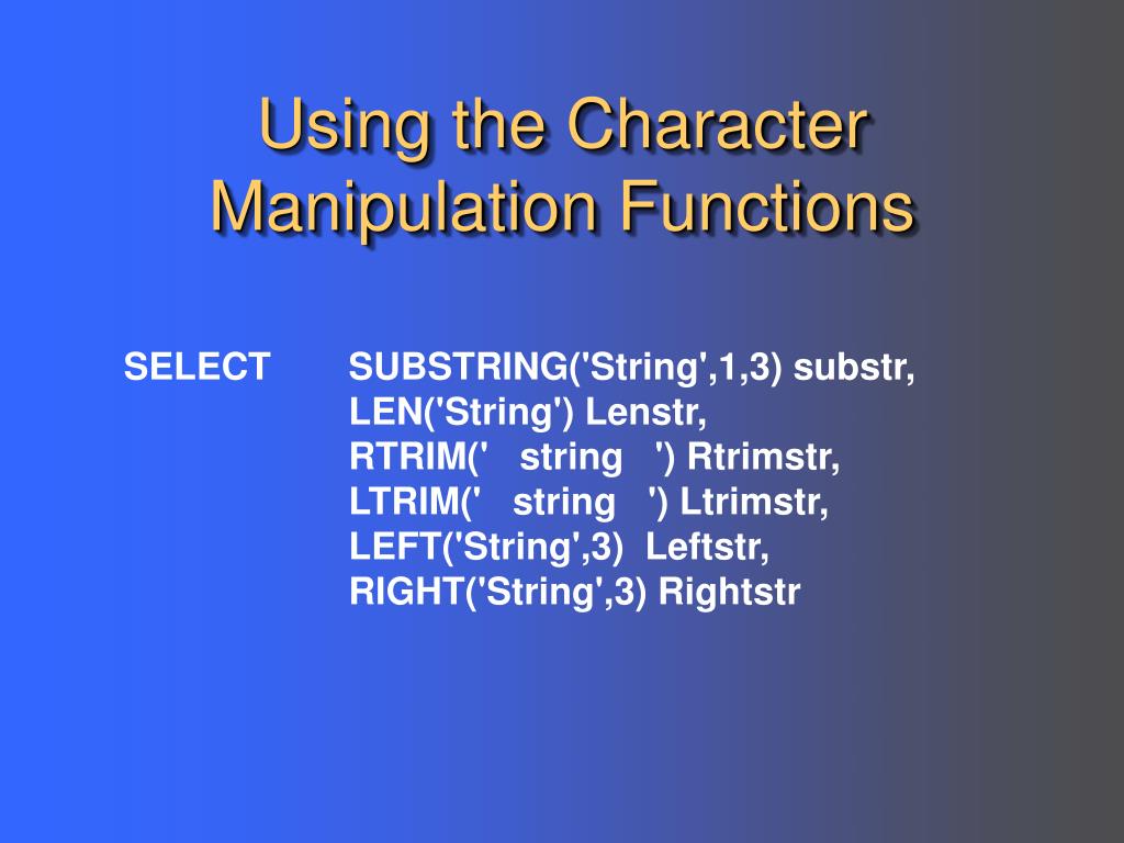 Using the Character Manipulation Functions SELECT SUBSTRING('String',1,3) substr, LEN('String') Lenstr, RTRIM(' string ') Rtrimstr, LTRIM(' string ') Ltrimstr, LEFT('String',3) Leftstr, RIGHT('String',3) Rightstr