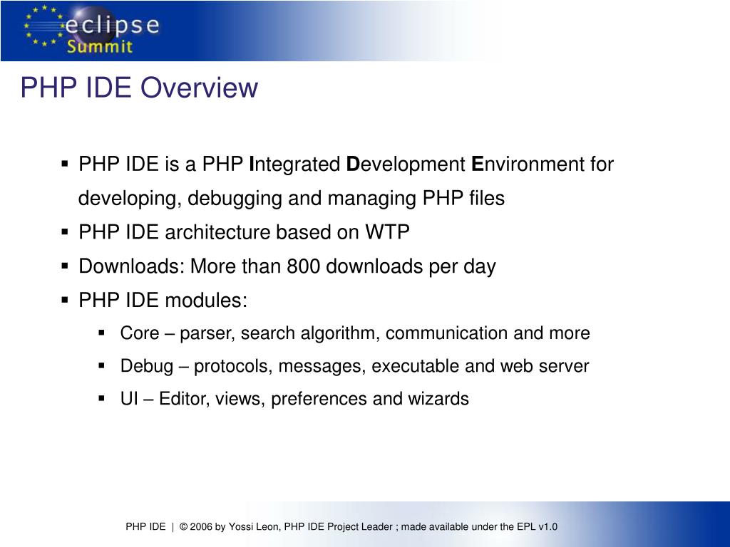 PHP IDE Overview • PHP IDE is a PHP Integrated Development Environment for developing, debugging and managing PHP files • PHP IDE architecture based on WTP • Downloads: More than 800 downloads per day • PHP IDE modules: • Core – parser, search algorithm, communication and more • Debug – protocols, messages, executable and web server • UI – Editor, views, preferences and wizards
