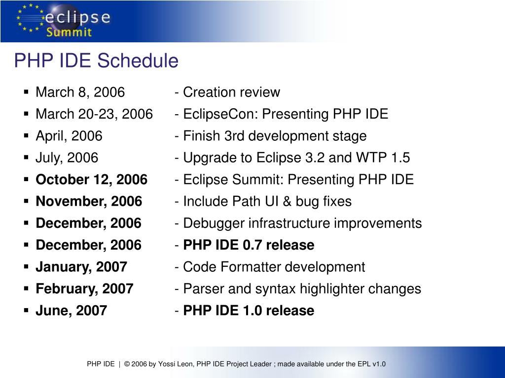 PHP IDE Schedule • March 8, 2006 - Creation review • March 20-23, 2006 - EclipseCon: Presenting PHP IDE • April, 2006 - Finish 3rd development stage • July, 2006 - Upgrade to Eclipse 3.2 and WTP 1.5 • October 12, 2006 - Eclipse Summit: Presenting PHP IDE • November, 2006 - Include Path UI & bug fixes • December, 2006 - Debugger infrastructure improvements • December, 2006 - PHP IDE 0.7 release • January, 2007 - Code Formatter development • February, 2007 - Parser and syntax highlighter changes • June, 2007 - PHP IDE 1.0 release