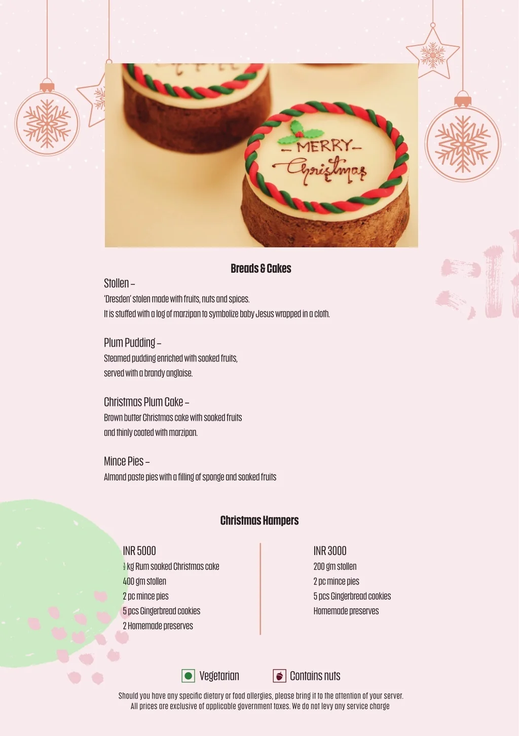 Breads & Cakes Stollen – ‘Dresden’ stolen made with fruits, nuts and spices. It is stufed with a log of marzipan to symbolize baby Jesus wrapped in a cloth. Plum Pudding – Steamed pudding enriched with soaked fruits, served with a brandy anglaise. Christmas Plum Cake – Brown butter Christmas cake with soaked fruits and thinly coated with marzipan. Mince Pies – Almond paste pies with a filling of sponge and soaked fruits Christmas Hampers INR 3000 200 gm stollen 2 pc mince pies 5 pcs Gingerbread cookies Homemade preserves INR 5000 ½ kg Rum soaked Christmas cake 400 gm stollen 2 pc mince pies 5 pcs Gingerbread cookies 2 Homemade preserves Vegetarian Contains nuts Should you have any specific dietary or food allergies, please bring it to the attention of your server. All prices are exclusive of applicable government taxes. We do not levy any service charge