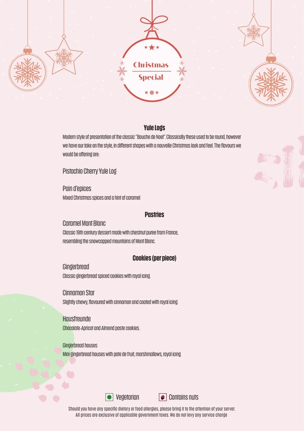 Christmas Special Yule Logs Modern style of presentation of the classic “Bouche de Noel”. Classically these used to be round, however we have our take on the style, in diferent shapes with a nouvelle Christmas look and feel. The flavours we would be ofering are: Pistachio Cherry Yule Log Pain d’epices Mixed Christmas spices and a hint of caramel Pastries Caramel Mont Blanc Classic 19th century dessert made with chestnut puree from France, resembling the snowcapped mountains of Mont Blanc. Cookies (per piece) Gingerbread Classic gingerbread spiced cookies with royal icing. Cinnamon Star Slightly chewy, flavoured with cinnamon and coated with royal icing. Hausfreunde Chocolate-Apricot and Almond paste cookies. Gingerbread houses Mini gingerbread houses with pate de fruit, marshmallows, royal icing. Vegetarian Contains nuts Should you have any specific dietary or food allergies, please bring it to the attention of your server. All prices are exclusive of applicable government taxes. We do not levy any service charge
