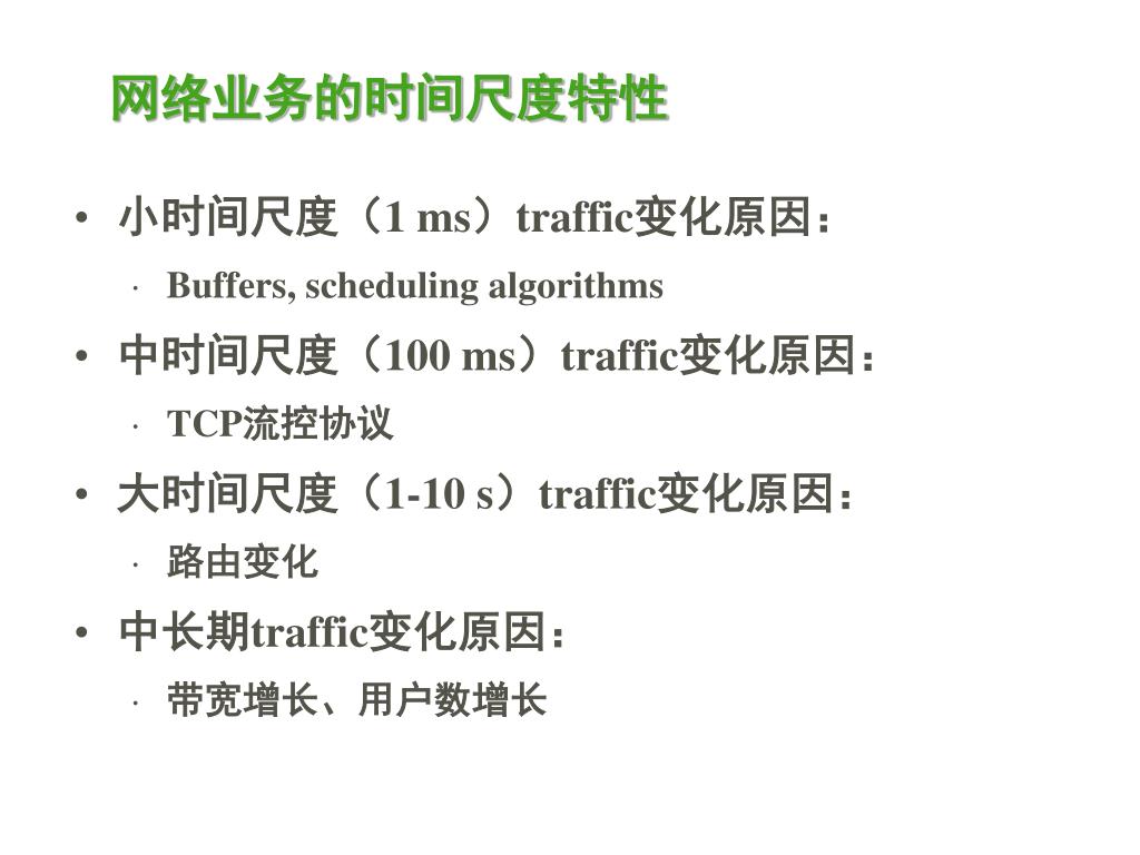 网络业务的时间尺度特性 • 小时间尺度(1 ms)traffic变化原因: • Buffers, scheduling algorithms • 中时间尺度(100 ms)traffic变化原因: • TCP流控协议 • 大时间尺度(1-10 s)traffic变化原因: • 路由变化 • 中长期traffic变化原因: • 带宽增长、用户数增长