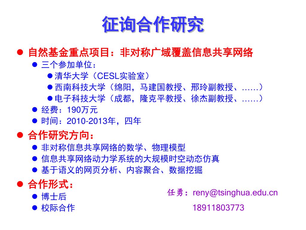 征询合作研究 • 自然基金重点项目:非对称广域覆盖信息共享网络 • 三个参加单位: • 清华大学(CESL实验室) • 西南科技大学(绵阳,马建国教授、邢玲副教授、……) • 电子科技大学(成都,隆克平教授、徐杰副教授、……) • 经费:190万元 • 时间:2010-2013年,四年 • 合作研究方向: • 非对称信息共享网络的数学、物理模型 • 信息共享网络动力学系统的大规模时空动态仿真 • 基于语义的网页分析、内容聚合、数据挖掘 • 合作形式: • 博士后 • 校际合作 任勇:reny@tsinghua.edu.cn 18911803773