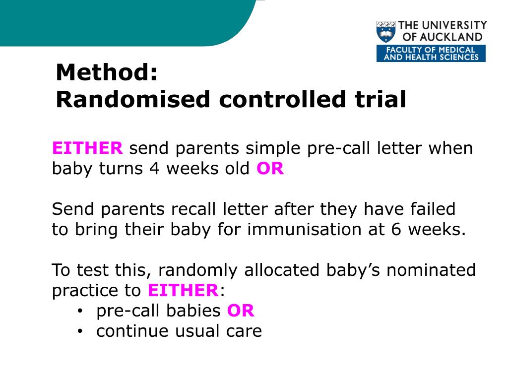 Method: Randomised controlled trial EITHER send parents simple pre-call letter when baby turns 4 weeks old OR Send parents recall letter after they have failed to bring their baby for immunisation at 6 weeks. To test this, randomly allocated baby’s nominated practice to EITHER: • pre-call babies OR • continue usual care