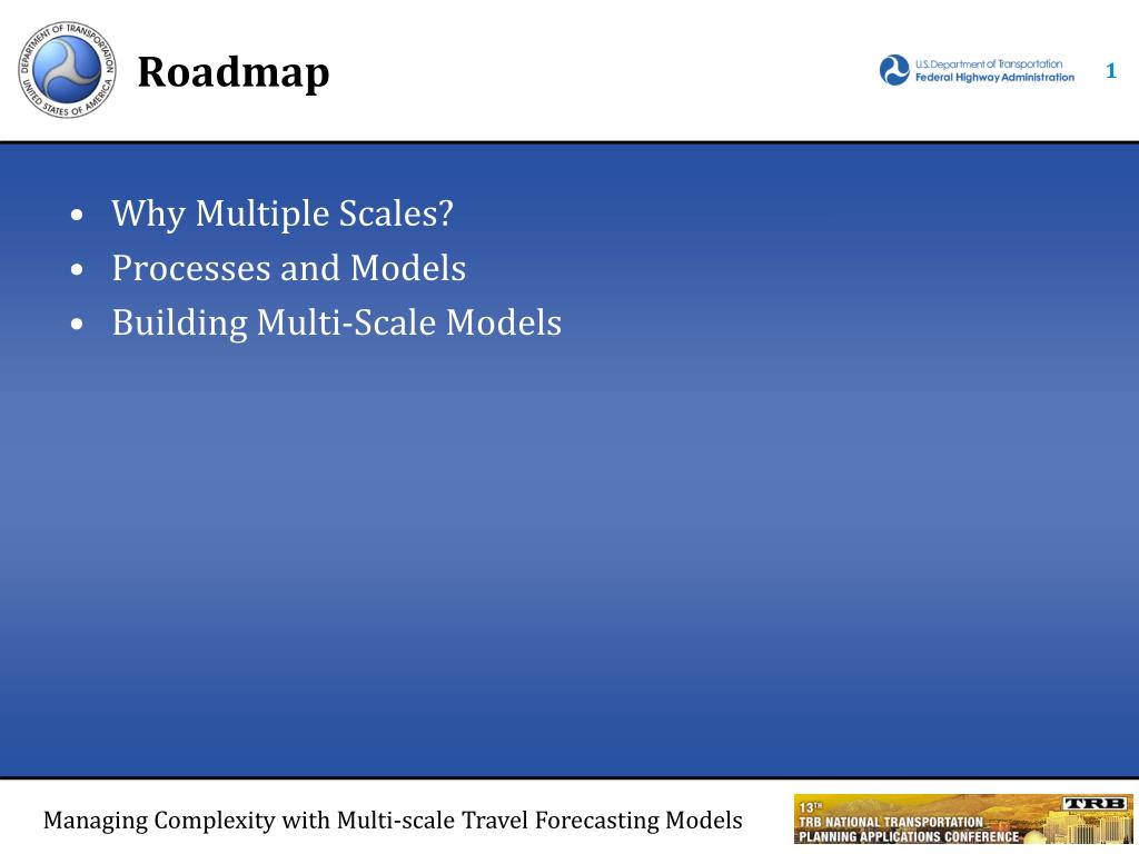 Managing Complexity with Multi-scale Travel Forecasting Models. Jeremy Raw Office of Planning Federal Highway Administration. May 11, 2011. Roadmap. Why Multiple Scales? Processes and Models Building Multi-Scale Models. Why Multiple Scales?. Computational speed Data resolution