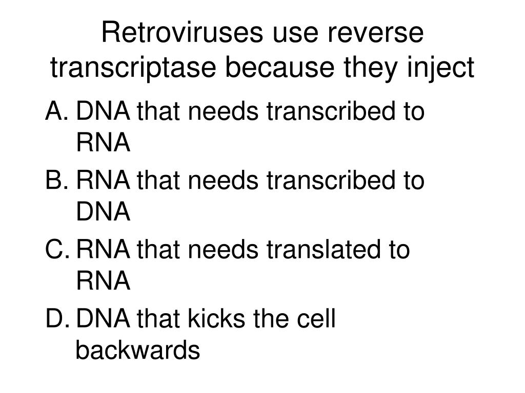 Retroviruses use reverse transcriptase because they inject • DNA that needs transcribed to RNA • RNA that needs transcribed to DNA • RNA that needs translated to RNA • DNA that kicks the cell backwards