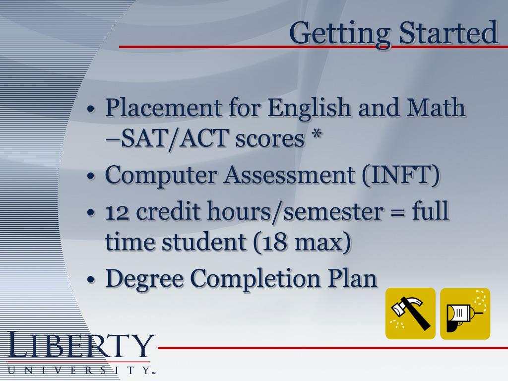 Getting Started • Placement for English and Math –SAT/ACT scores * • Computer Assessment (INFT) • 12 credit hours/semester = full time student (18 max) • Degree Completion Plan