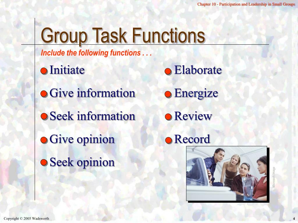 Group Task Functions Include the following functions . . . Initiate Give information Seek information Give opinion Seek opinion Elaborate Energize Review Record Microsoft Image