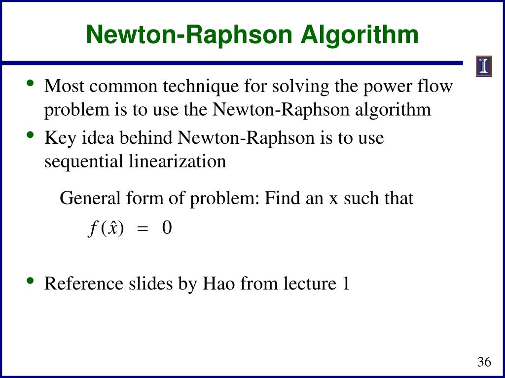 Newton-Raphson Algorithm • Most common technique for solving the power flow problem is to use the Newton-Raphson algorithm • Key idea behind Newton-Raphson is to use sequential linearization • Reference slides by Hao from lecture 1
