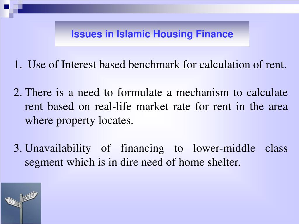 Issues in Islamic Housing Finance Use of Interest based benchmark for calculation of rent. There is a need to formulate a mechanism to calculate rent based on real-life market rate for rent in the area where property locates. Unavailability of financing to lower-middle class segment which is in dire need of home shelter.